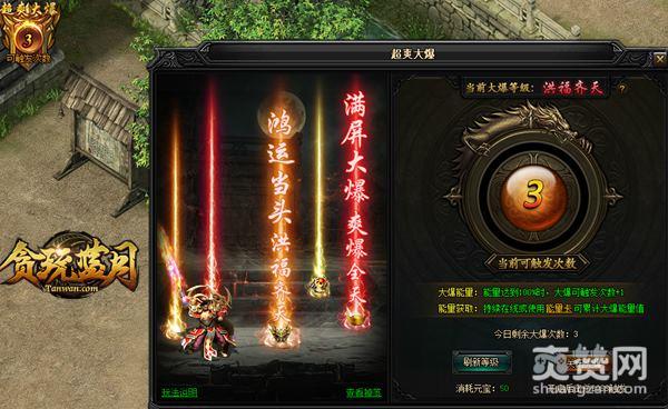 这名字一看上去就很牛,实际上真的很牛!贪玩蓝月这次的更新非常有意思,玩家达到80级即可开启 “超爽大爆”功能,只需积累能量值就能获得大爆次数, 开启“超爽大爆”后击杀任意BOSS均可触发大爆,高转装备及超稀有材料瞬间掉落!并且大爆的物品只有自己可拾取,爽就一个字,爆装更尽兴!