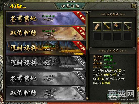 43u《热血战歌之创世》中当玩家达到280级以上就能开启苍穹禁地活动,活动时间在每天11:00-11:15、21:30-21:45开始。在战神要塞找到苍穹禁地NPC进入活动;也可以点击右上角小地图边上的活 进入世界活动界面。查看开启时间。