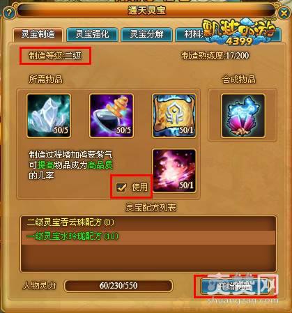 根据制造等级不同,可以制造不同等级的灵宝。每个等级的灵宝制造需要相应的物品,在“灵宝制造”面板上会显示出所需物品。在制造过程中可以选择增加鸿蒙紫气可提高物品成为高品质的几率。