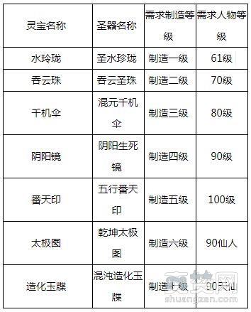 人物等级、制造等级对应可制造的灵宝详表: