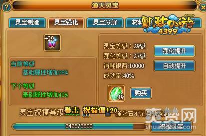 王者的追求,总是无止境的,新的灵宝总是能带来新的惊喜。当玩家等级达到61级时,游戏主界面右下角将出现“通天灵宝”功能键。《4399飘渺西游》通天灵宝根据灵宝等级、灵宝品质等不同提升相应的人物属性。