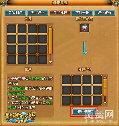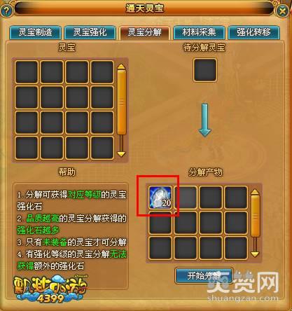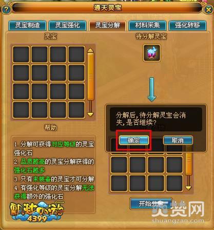 灵宝未装备时可对灵宝分解操作,灵宝分解原灵宝会消失。分解可获得对应等级的灵宝强化石。品质越高的灵宝分解获得的强化石越多。有强化等级的灵宝分解与无强化等级的灵宝分解所获得的强化石相同。