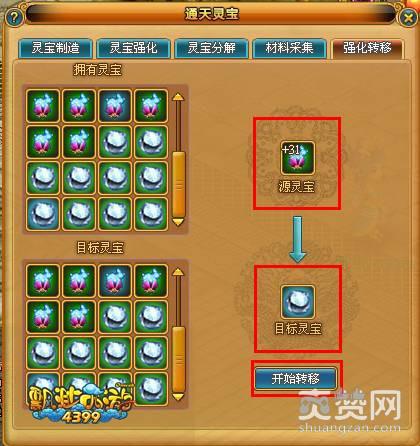 高等级灵宝可向低等级灵宝进行强化转移,转移完成后,源灵宝会消失,目标灵宝可获得源灵宝的强化等级。