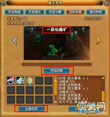 打开“材料采集”界面可以查看到当前的采集等级,根据采集等级决定可采集的矿藏的等级。采集结束后点击“全部收获”,可以获得采集物品。每次采集对应等级的矿藏会增加熟练度,熟练度满后并满足人物等级条件的采集等级将提升。根据所采集矿藏的等级每次采集消耗一定量的体力,体力上限按玩家人物等级增加,人物在线每5分钟自动回复5点体力。