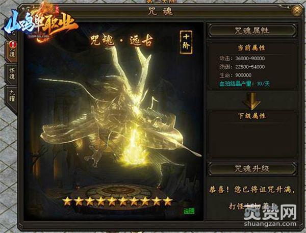 当开启咒魂后,每天可产出“血珀结晶”。咒魂共十阶,消耗“纯血精华”可以提升“咒魂等阶”,等阶越高,附加属性和“血珀结晶产量”越高。