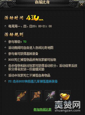 43u《斗破沙城之赤焰长歌》夜战比奇的活动时间是每周一、四、日晚上20:00-21:00,开启时右侧有开启活动提示,点击超链接或者小飞鞋,飞到活动NPC身边并且打开活动界面,点击参加夜战比奇链接则进入活动场景。