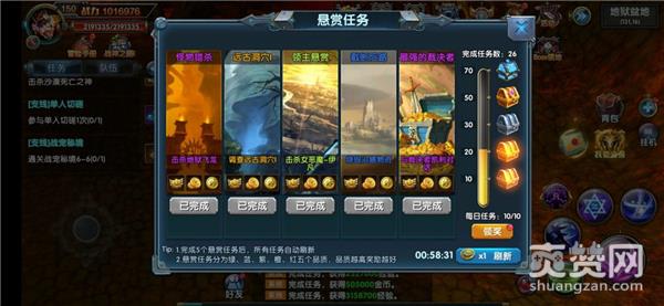 每位玩家每天只能完成10次悬赏任务,所以尽量挑选品质高且难度低的任务,当然,如果任务难度过大,还可以通过消耗钻石来立即完成任务。完成10次悬赏任务之后还会有额外的完成奖励,奖励里面包含钻石与宝石还有其他提升性的消耗道具,异常的丰厚,所以各位冒险可要好好努力了。