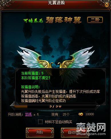 若想提升光翼等阶,需要消耗羽毛,光翼等阶越高需要消耗羽毛的个数就越多。光翼升阶失败会产生祝福值,当祝福值达到满值时,下次升阶必定成功。不过1-3阶光翼升阶时产生的祝福值没有时限,4阶以上光翼产生的祝福值则会在每日6:00清空。
