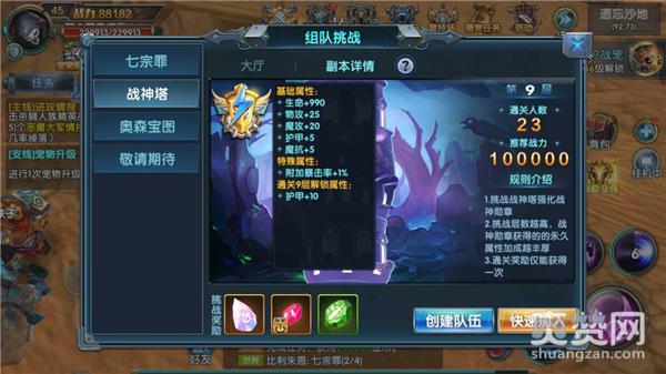每天玩家可以挑战战神塔副本5次,并且可以组队挑战,每一层挑战成功会有基础属性永久加成,通关特定楼层还有额外的特殊属性加成。玩家还可以通过点击副本详情查看,当前挑战楼层的通关人数与战力要求,来做好阵容搭配。
