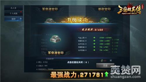 官印是成就玩法中非常重要的组成部分,主公拥有官印不仅仅可以获得权利,更重要的是可以大幅提升角色战斗力。进入【成就】系统,点击“官印”,玩家即可看到当前暂无官印等级,下级官印等级为军祭酒官印,也就是我们奋斗的目标。