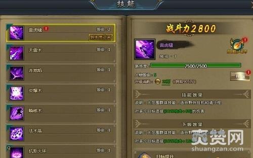 2)天雷术:从空中召唤一道天雷攻击敌人,造成目标相应比例攻击+相应点数的伤害(单体高伤害技能,适合PK打架)。
