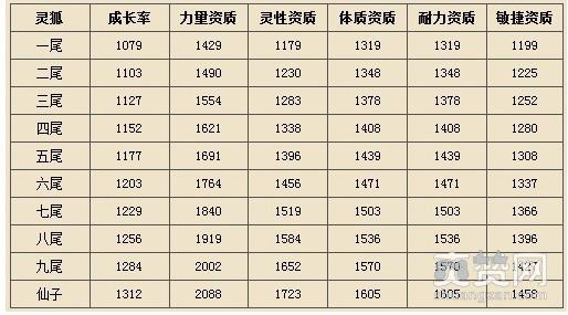 上表是各阶段变异灵狐的资质,极限资质需在此基础上乘以1.03,方便大家在洗宠物时参照。