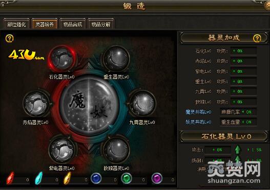 升级器灵等级,可为对应的妖器提供“攻、防基础属性”加成。要使加成生效,必须佩带对应的妖器。装备的妖器基础属性越高,所获得的加成也就越多。