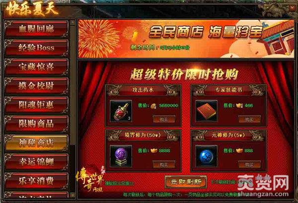 消暑的一个途径就是买买买,不仅能够得到稀有装备,还能享受购物的乐趣!活动期间,玩家可在神秘商店中购买商品,商品可用金币,绑元,元宝进行购买。神秘商店每2小时自动刷新一次,也可用花费元宝立即刷新;不同礼包,买买买,请查看游戏内更多新礼包内容!