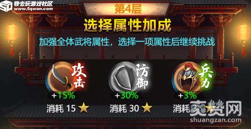 在通天塔的闯关中,玩家每闯满5层可领取1次奖励,中间还能得到一次全体武将属性加成的机会。全体武将属性加成需要花费星数来兑换,不同幅度的属性加成消耗的星数也不相同。闯关前期的话,建议大家选择防御或兵力的属性加成,这样可以降低武将战力下降的速度。因为通天塔中武将掉血、阵亡都不会恢复,所以前期要保存一些实力才可能走得更远。