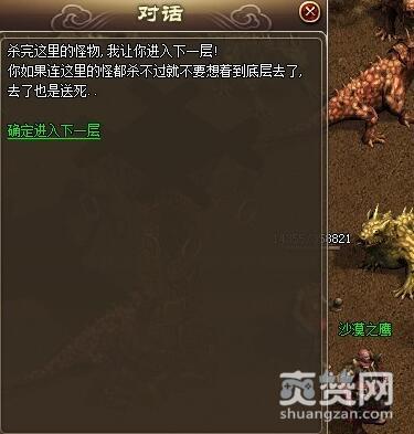 若大家能经过重重考验,即可开始挑战最后一个关卡——镇守BOSS巨灵沙神王!巨灵沙神拥有全屏的刺攻击,还有一群四脚巨蜥怪的随从掩护,对大家来说可谓是个极大的挑战。不过,若能击杀巨灵沙神王,转生装备、中低阶宝石、雪霜和奔雷装备将可收入囊中!
