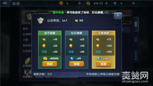 加入公会后,每位成员都可以进行捐献,每日有五次机会。捐献分为三种等级,分别是金币捐献、钻石捐献与至尊捐献,捐献的等级越高,公会获得的资金也会越多,当达到一定量的公会资金就可以完成升级。捐献除了获得公会资金以外,还能额外获得一定量的公会币,公会币可以用来在公会商店中兑换珍稀道具,所以每一天的捐献次数千万不要浪费了哦。