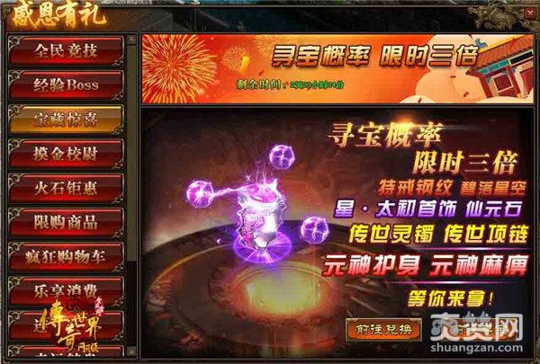 你们是不是纳闷传世君为什么每次都要介绍这个,因为这个真的超值!寻宝概率可是翻倍的极高几率获得星·太初首饰、仙元石、碧落星空,传世灵器·项链碎片、传世灵器·手镯碎片、元神护身特戒以及元神麻痹特戒哦!赶紧点击游戏,参与寻宝吧!
