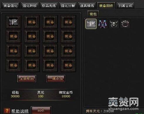 最后一个要说的是熔炉系统中最实用的功能——装备回收,只要是装备等级大于45级且是非神兵类装备就可以进行回收。装备回收可以将装备转化成经验、灵元、金币,等级越高级的装备,可以获得的奖励也就越高。