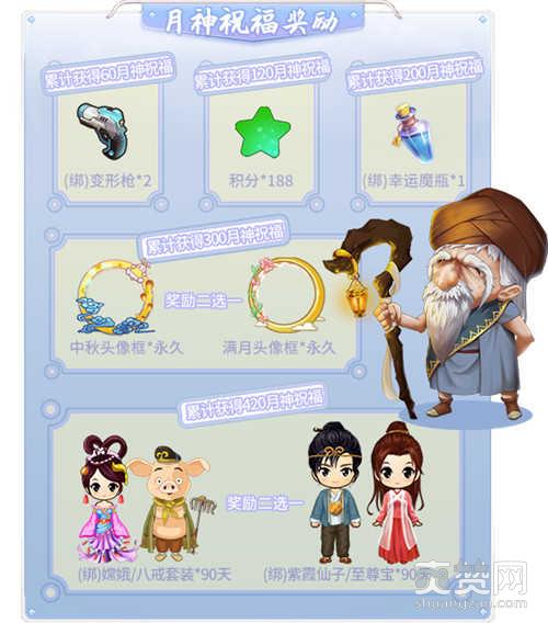 活动期间,每完成一份“月神的任务”可以获得20份“月神祝福”,收集“月神祝福”,领取中秋节专属套装:至尊宝、紫霞仙子!