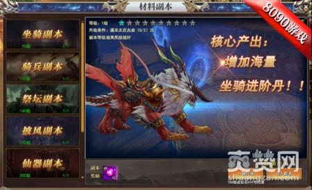 材料副本包括坐骑副本,骑兵副本,祭坛副本,披风副本,仙器副本,魂晶副本,法阵副本等。按照用户角色等级渐次开启。每一个副本都会奖励对应系统的进阶道具。