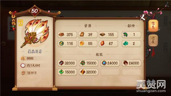 最后的终极图纸,也是我们这次话题的主角-星辰日月,相比之前的探索减休装备都是锤斧之类,适用于近战,此次扇类的崛起,也预示着法师无休套路的可行性,新增了探索可玩性。再回到图纸的本身,虽然资源需要种类众多,但星辰日月的售价方面也是突破接近2000W万,想必成史诗以上装备就要过亿。配件方面需要37级的紫色玄武扇与24级探索材料青龙鳞,另外这把武器的天赋技能想必是性价比最高的了,2级的时不我待,减10%探索休息时间,极大提高了探索材料的收取进度,极具效益价值。