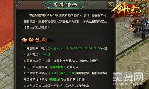 萝卜玩《创世》屠魔猎场每周二、四、六的11:00-11:30和21:30-22:00时间段开启。每次开启时长半个小时,游戏角色等级达到300级能参与活动。前往战神要塞地图找到屠魔猎场NPC进行对话,进入屠魔猎场。击杀屠魔猎场场景内的BOSS会掉落积分屠魔卷轴和装备等。