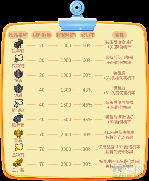 合成装备需要消耗“水晶”,装备合成失败,则退还部分水晶,已花费的游戏币不进行退还。各个装备所需水晶、游戏币根据装备属性不同而不同,详情如下: