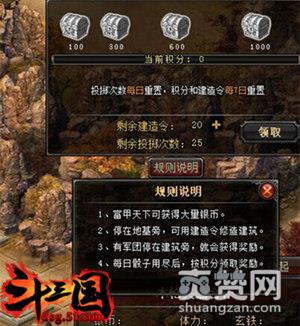 当主公们进入51《斗三国》中的富甲天下后,主公们是先手,使用鼠标点击骰子决定行军步数;若主公们落到地基旁边,便可以建造建筑!接着轮换到其他三位电脑军团进行投骰子行军,若能停到主公们建造的建筑边主公们可以得到大量的银币奖励。而且我们贴心的每天为主公们免费提供25次投掷次数和20个建造令哦,其中投掷次数每日重置,而建造令和积分每七天重置呢!