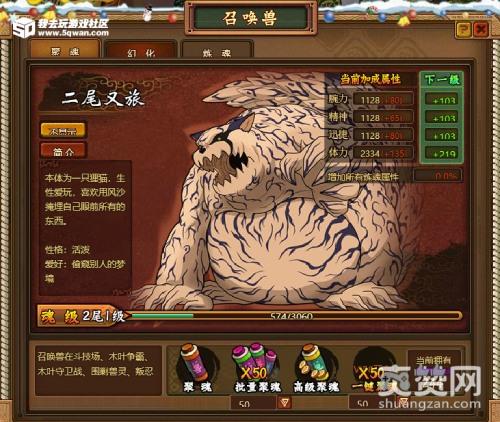 完成21级主线任务后,玩家将获得一只召唤兽。召唤兽在斗技场、木叶争霸等PVP环境里对忍队属性有一定加成作用,能大幅度提高忍队战斗力。玩家对召唤兽进行升级培养,可增加召唤兽属性。召唤兽的培养方法主要是聚魂升级。聚魂分银两聚魂和金币聚魂。银两聚魂包括普通聚魂和批量聚魂;金币聚魂则包括高级聚魂和一键聚魂。聚魂使用的货币会影响召唤兽的经验值,使用货币越珍贵,召唤兽得到的经验值就越多。召唤兽聚魂时有一定几率出现暴击,暴击分为大暴击和小暴击,小暴击是经验加倍,而大暴击可直接升级。