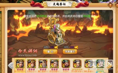 重生献祭规则介绍:1. 消耗一点的绑定元宝对武将进行重生,重生会将武将退回至未招募的状态,并且返还培养消耗的大部分资源,完美重生会返回所有消耗的额资源。