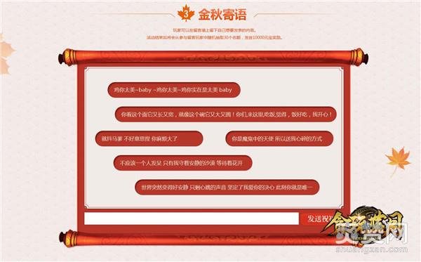 这个就有趣了!就是一个让你们畅所欲言的地方呢~说出你想说的话吧,只要在留言墙上留下自己想要发表的内容,活动结束后我们将会抽取30个名额,发放10000的元宝奖励哦!没错,10000的元宝,只要你动动小指头就有机会拿到啦!不说了,小编也去留言啦~