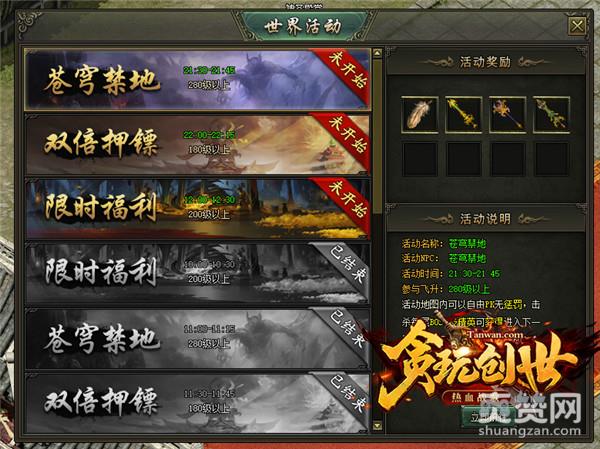 在战神要塞找到苍穹禁地NPC进入活动。也可以点击右上角小地图边上的活 进入世界活动界面。查看开启时间。活动地图内玩家可以自由PK无惩罚,打每层BOSS及精英可获得进入下一层的通行证呢,如果你能打败十层最终BOSS可是有概率获得高转武器。希望在座的兄弟们都能打败最终boss!