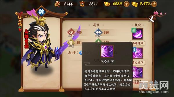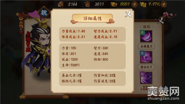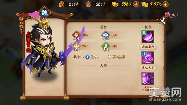 细数新出的武将,禁士猛将各有一位,但纯正的法师却仍然缺少,枭雄曹操的登场很好的补上了这一块空档。可圈可点的属性,除了力量方面稍微薄弱,其它属性通通突破了200大关,甚至核心智力属性达到了惊人的330.另外,枭雄曹操在成长方面也是属实出类拔萃,相信在细心培养之下,日后绝对是一只强大的远程法术奇旅。