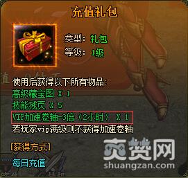 第二种是需要玩家通过进行每日充值获取到vip加速卷轴-3倍(2小时),每天玩家通过充值可以获得4个,杀一只boss相当于杀了3只,vip成长速度+2。