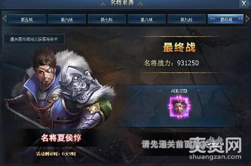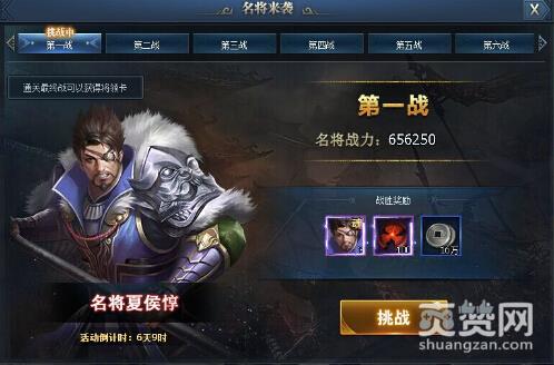 活动玩法:挑关成功可以获得对应奖励,完成最终通关,即可获得夏侯淳将领卡