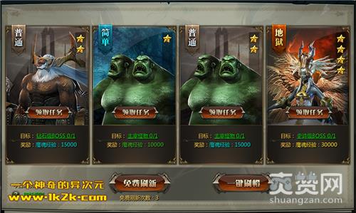 1k2k《浴血战魂》的对决任务通过击杀选定的BOSS来获得魔魂经验,该玩法共有两种刷新BOSS的方式,第一个是“免费刷新”,第二个是“一键刷橙”需要消耗200钻石,BOSS难度分为:简单、普通、困难、地狱,四种难度,不同难度不同奖励,难度越高奖励越丰厚,每日可进行10次对决人物,次日刷新,接取后不可放弃
