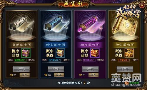 每天玩家可以通过消耗绑定元宝或者元宝进行购买藏宝图,使用藏宝图后,将会显示一个藏宝坐标点,前往可以挖去宝物,每天最多可以使用10次藏宝图。