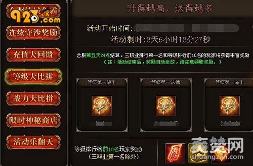 除了让人热血沸腾的竞技和排行外,923yx《烈火战神》中还有高额的充值奖励。在跨服大战期间充值达到3000元宝的勇士将可以获得麻痹戒指、8倍经验神符、英雄和金蚕王,若是名列前三甲的还能获得战神宝甲、战神腰带和战神靴子!