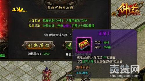 色每在线10分钟,能量值就会增加10%;另外,使用能量卡也可增加能量值,击杀野外BOSS有一定概率掉落能量卡,每日大爆次数达到上限后,能量值就不再增加。
