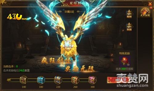 43u《盛世遮天》在玩家们达到150级时即可开启,点击主城NPC打开界面,这是一个刷怪玩法,通过击杀一定怪物数量来领取奖励。