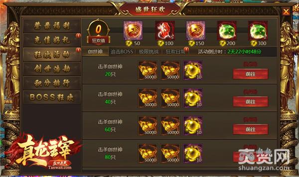 完成任务获得奖励和狂欢值,狂欢值达到指定数量可领取对应的好奖励,活动期间击杀创世神达到指定只数即可领取丰厚奖励!