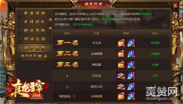 击杀1500级以上的BOSS和转生BOSS即可获得BOSS积分,活动结束后按积分排名发放奖励!还有BOSS复活时间减半(跨服BOSS除外)的强buff助阵。