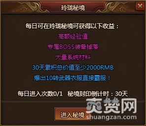 在小伙伴们进入秘境后,每日可在玲珑秘境中获得以下收益:高额经验值、专属BOSS装备掉落、大量系统材料,30天累积总价值至少2000RMB,来跟随小编来一探究竟吧。