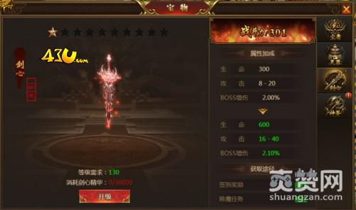 3、剑心:130级可激活,可增加角色生命、攻击和BOSS增伤;升级需要消耗剑心精华,主要通过除魔任务和日常押镖获取。