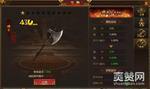 4、神斧:150级可激活,可增加角色暴伤、暴击和BOSS暴击;升级需要消耗神斧精华,主要通过捐献任务和野战比奇玩法获取。