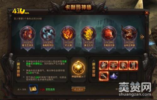 43u《暗黑大天使》中当玩家3个角色到达260级之后,就可以开启“卡利玛神庙”的挑战,在游戏界面上方图标处,可以找到“卡利玛神庙”的图标入口。