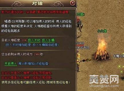 投入不同等级的木材增加的火堆旺度各不同,若投入水桶还可将火焰熄灭。饮用不用等级的酒类获得的经验也不同,只要在火堆附近双击酒瓶,就可以增加经验。获得经验的多少和火堆的旺度,以及酒瓶的品质有关。