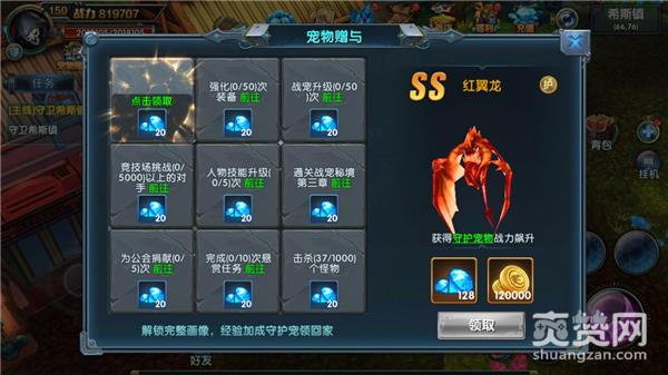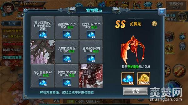 玩家达到38级则可以解锁宠物赠与功能,并且打破所有的石板之后就能免费获得一只品质SS级的守护战宠红翼龙。每一个石板都对应着一项任务、其中包括达到指定等级、完成强化装备指定次数、战宠升级、竞技场挑战、人物技能升级、通关战宠秘籍指定章节、公会捐献、完成悬赏人物、击杀指定数量的怪物等指标。