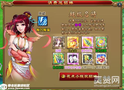 所有玩家只需消费100元宝,就可获得官方送出的精美大礼包一份!【礼包内容】:礼金*88、30级对应职业武器、30级套装之手镯、30级套装之护符、双倍经验丹*1、日常任务卷轴*1、铜钱符*1000、貂蝉、低级潜能丹*5